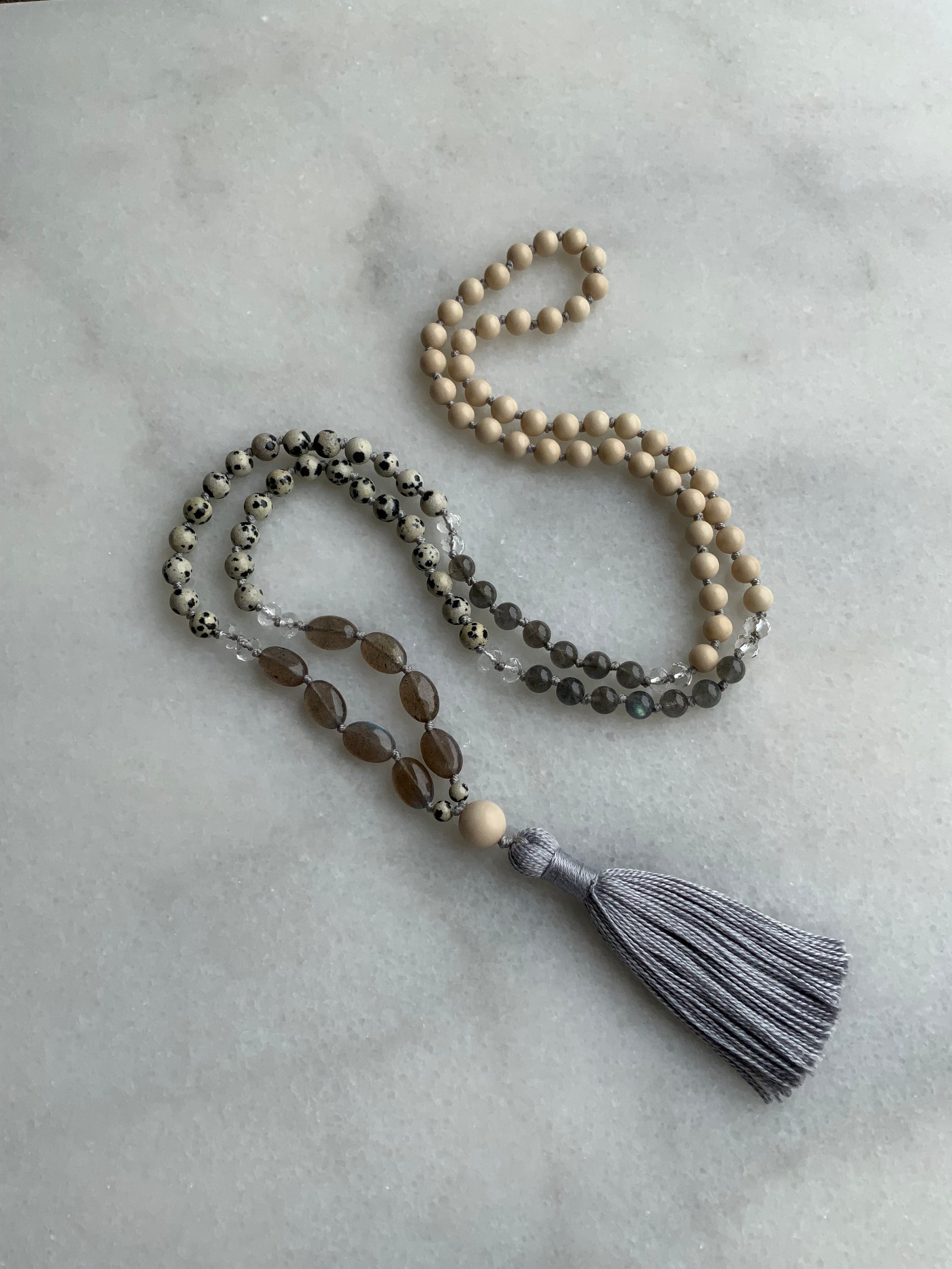 Hand knotted on grey strong nylon thread with a mix of 6mm Dalmatian Jasper, 6mm cream river stone, 6mm labradorite, 6mm faceted clear Quartz Rondelle & AAA labradorite oval beads then finished off with a 10mm River Stone guru bead & a soft 100% cotton grey 3 inch tassel.
